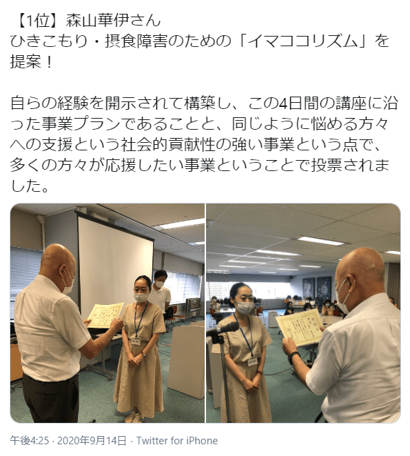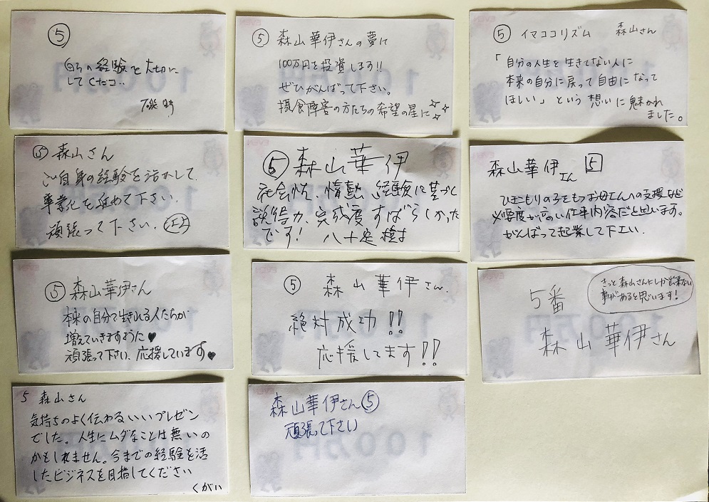 これだけでも、「よく頑張った!」と自分で思いましたが、20 名のプレゼンを聞いて 共感した人に 100 万円を投資するごっこのワークがあり、信じられないことに一位に選ばれ表彰されました。